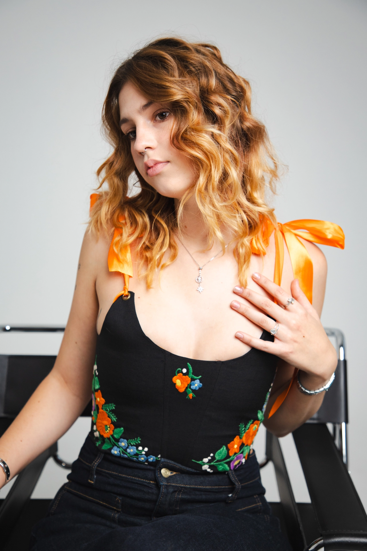 Népi ihletésű virágmotívumok díszítik, modern, könnyen viselhető elrendezésben.